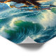 A powerful bald eagle descends with outstretched talons to snatch a fish from the crest of a wave in a dynamic display of natures drama. The oceans turbulent waters reflect the golden hues of a setting sun, while the birds focused gaze and the fishes desperate leap epitomise the life-and-death struggle of the animal kingdom.