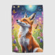 A majestic fox sits in a field of vibrant flowers, gazing up at the sky. Its beautiful red fur shines with white accents, and its pointy ears are alert. Butterflies flutter among the blossoms, surrounded by pink and purple hues. The fox rests gracefully in the long grass, encircled by the colorful flowers.