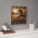 A powerful horse leaps gracefully across a sunlit landscape filled with golden fields and grazing companions, under the warmth of a glowing sunset.
