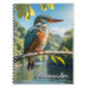 A stylish spiral bound notebook, featuring a cover picture of a majestic kingfisher by the river. The tranquil scene shows the colourful bird sitting on a branch, with sunlight on the leaves, adding a touch of the natural world to your stationery supplies. Personalise the notebook with a name in elegant script typography. An ideal gift for lovers of nature and wildlife.
