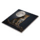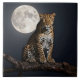 A powerful leopard with piercing yellow eyes and a sleek, spotted coat sits majestically on a stark, solitary branch. One paw dangles artfully across the center of the illustration, hinting at movement. Behind him, a vast, luminous harvest moon hangs in the inky night sky, casting an ethereal glow. Awesome tile for anyone who loves leopards.