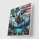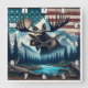 A large moose stands prominently in front of snow-capped mountains and an American flag backdrop, surrounded by evergreen trees and a flowing river.