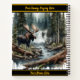 A magnificent moose stands near a serene waterfall, surrounded by lush trees and fallen logs. The peaceful setting showcases nature's beauty, with birds flying overhead.