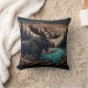 A detailed carving of a moose stands by a flowing river, surrounded by lush trees and rocks, highlighting the beauty of wilderness.