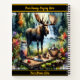 In a vibrant forest, a majestic moose stands by a shimmering waterfall. Surrounded by colourful foliage, nature's beauty blends with rustic elements on a wooden table nearby.