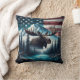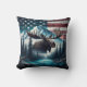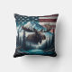 A moose stands proudly amidst a backdrop of mountains and pine trees, with an American flag and river enhancing the stunning natural scenery.