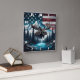 A moose stands proudly amidst a backdrop of mountains and pine trees, with an American flag and river enhancing the stunning natural scenery.