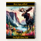 A solitary moose grazes peacefully near a tranquil mountain lake, surrounded by vibrant autumn foliage and towering cliffs under a colourful sky at dusk.