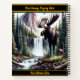 A magnificent moose stands proudly near a serene waterfall, surrounded by lush forests and distant mountains, capturing the beauty of nature in this peaceful wilderness.