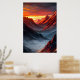 A breathtaking digital painting captures a majestic mountain range bathed in the warm glow of a setting sun. The sky is ablaze with vibrant hues of orange, red, and yellow, casting long shadows across the rugged peaks. The lower slopes are shrouded in a soft, ethereal mist, adding a sense of mystery and tranquillity to the scene.