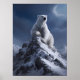 A magnificent polar bear rests calmly on the peak of a snow-covered mountain, its white fur blending seamlessly with the wintry landscape.