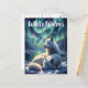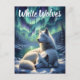 Two white wolves are sitting gracefully in the glistening snow under a stunning aurora borealis, their fur blending seamlessly with the winter landscape.