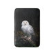 Animal portrait photograph of majestic snowy owl standing on a branch.