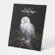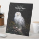 Animal portrait photograph of majestic snowy owl standing on a branch with a personalizable custom name monogram above.