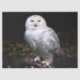 Animal portrait photograph of majestic snowy owl standing on a branch.