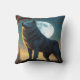 A powerful wolf stands on a cliff, illuminated by the full moon, as it howls into the night, surrounded by silhouette trees against a twilight sky.