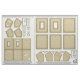 Make 2 small picture frames with this fat quarter of Zazzle fabric! This fat quarter has 10 panels of fabric laid out for each pearl / natural / ivory / cream coloured photo frame, for making WASHABLE, NO SEW, FABRIC PICTURE FRAMES, for photo sizes 1 1/2" x 2 1/2" and 2 1/2" x 3 1/2" - wallet sized! AND - the smallest frame is a convertible frame, meaning you can take the strut leg pocket, that allows the frame to be tabletop, remove it from its velcro / hook & loop connections, and insert a stainless steel, bar pin back, that is removable! The back panel has velcro for the strut leg pocket at its top and a bottom right connection for the ribbon to be removed too, AND has 2 holes to hang the frame, as well as 2 vertical holes to allow for the pin back's mechanism to push through and stay in place! There is a pocket up front for the mat board OR cardboard easel back board, as well as the photo and its photo sleeve, a ACID FREE, CLEAR, SHEET PROTECTOR PAGE cut to the size of the photo! Velcro / hoko & loop is cut down & glued at the top inside between the inside front frame panel, called the 2nd inside frame front border, or 2nd Inside FFB, and the top facing frame middle panel or FM All of the fabric panels are labelled what they are, have seam allowances around the main panel parts to cut around, lines to cut along to cut away excess corner fabric, circles to indicate holes to be poked and cut out, areas marked for where to put the velcro / hook & loop - for both frames! Easel back and strut leg board patterns are ON the fabric, as well, just cut out, and transfer to mat board or cardboard. The holes on 3 of the 10 panels, for each frame, get 1/8" skinny ribbon thread through them, to connect all 3 panels, making the photo pocket. SUPPLIES NEEDED: THERMOWEB HEAT N BOND at least 1 yard x 17" wide, sold for $1.99 / yard at JoAnn Fabrics, in 1 yard pack at JoAnn, in a 5 yard roll 17" wide at Michaels or michaels.com for $8.99, make sure to use a 40% or 50% off coupon or sale to save money. It's also available at joann.com, Walmart.com Thermoweb Heat n Bond Lite OR Ultrahold - I use Ultrahold - it is acid free, perfect for this project, being that it's for photo. Heat n Bond is a paper backed, iron on, fabric glue fusbible web that gets ironed to the back of the fabric panels - it is used for your PATTERNS! Just take sheet protectors, 4 or 5, and trace over the whole panel pattern, including the seam allowance. Flip the sheet protector page pattern OR clear vinyl pattern, if you want, and transfer both the outer seam allowance line AND inner panel, onto the paper back side of the Heat n Bond. Use straight pins, poke through from the front, at all the corners, 4 corners on 6 panels, and 5 corners on the strut leg panels, flip the fabric over to the back, and centre your Heat n Bond patterns, glue side down, between the pins. NOTE: For strut leg panels, make sure you trace over those 2 horizontal lines angled inside the strut leg Heat n Bond patterns. Then when you make the Heat n Bond strut leg panel patterns, cut away that centre strip, BUT use it as a gauge to place the remaining top and bottom parts of the strut leg Heat n Bond patterns in place. That area where the centre strip was removed will be clear of Heat n Bond, and will allow the strut leg pocket to BEND out, to pitch, for the frame to stand on a table or shelf! RIBBON: 2 lengths, 2 feet each by 1/8" wide for each frame, for connecting the 3 panels for the photo pocket 2 lengths, 9" long by 3/8" wide for each frame, for connecting the bottom right corners of the strut leg pocket, between the layers, and between the easel back, and frame middle panels, with velcro / hook & loop on the smallest frame MAT BOARD or cardboard at least a piece 6" x 4", can be bought at Michaels for $5 for 20x30" piece, 8x10" scrap for $1 at JoAnn Fabric superstores in the framing department, or AC Moore $8 for a 32x40" board - 1/16" thick hot glue sticks 15, low temp hot glue gun iron printer paper, ruler, pen or pencil paper scissors fabric scissors EMBROIDERY SCISSORS - IMPORTANT! $10 at Michaels or JoAnns, recommend Gingher brand - this will allow you to poke into those circles and cut out the holes on the 3 panels that make the photo pocket - do this AFTER you have ironed the Heat n Bond patterns to the back SHEET PROTECTOR PAGES - 50 pack, make sure the pack is labelled acid free, can be found at Walmart or Walgreens for under $4, $5 at Target STAINLESS STEEL METAL BAR STYLE PIN BACKS, PACKS OF 10, 44, 48 AT Michaels, michaels.com, AC Moore, under $4 per pack, use a store coupon or sale to save. 1 3/4" long each VELCRO / aka HOOK & LOOP white or grey, or black, 1 yard by 3/4" wide sold in JoAnn Fabrics for $1 in their notions area wall section or in their $1 bins - cut the width in half to 3/8" wide or if you can get it to 1/4" wide that's great, too, 1 1/2" long roughly - just cut a length 1 1/2" long, and cut down the middle horizontally, for both hook and loop parts, one set of strips for the photo pocket closure, the other for the attaching of the strut leg pocket to the easel back panel facing out. Then cut a square for both hook and loop 1/2" x 1/2" for joining the ribbon dangling out of the strut leg pocket to the easel back's right bottom corner, folded over twice. LEGEND: FRONT FFB: front frame front border, front of frame, with PW, or picture window - photo area, centred 2nd inside FFB: situated under front FFB, Heat n Bond ironed on side facing up, picture window inner edge hot glued to picture window edge of front FFB - has 7 holes for thread ribbon through, connecting it to the 2 FM or frame middle panels, making the photo pocket FM: frame middle, you get 2, inside facing, or TOP, and facing out, or BOTTOM - the 2nd inside FFB is connected to them on one side, the EB, or easel back panels are connected on the other side of them, for making the easel back board and pin back pocket EB: easel back panels, you get 2, one facing inside, the