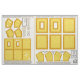 Make 2 small picture frames with this fat quarter of Zazzle fabric! This fat quarter has 10 panels of fabric laid out for each sunny yellow photo frame, for making WASHABLE, NO SEW, FABRIC PICTURE FRAMES, for photo sizes 1 1/2" x 2 1/2" and 2 1/2" x 3 1/2" - wallet sized! AND - the smallest frame is a convertible frame, meaning you can take the strut leg pocket, that allows the frame to be tabletop, remove it from its velcro / hook & loop connections, and insert a stainless steel, bar pin back, that is removable! The back panel has velcro for the strut leg pocket at its top and a bottom right connection for the ribbon to be removed too, AND has 2 holes to hang the frame, as well as 2 vertical holes to allow for the pin back's mechanism to push through and stay in place! There is a pocket up front for the mat board OR cardboard easel back board, as well as the photo and its photo sleeve, a ACID FREE, CLEAR, SHEET PROTECTOR PAGE cut to the size of the photo! Velcro / hoko & loop is cut down & glued at the top inside between the inside front frame panel, called the 2nd inside frame front border, or 2nd Inside FFB, and the top facing frame middle panel or FM All of the fabric panels are labelled what they are, have seam allowances around the main panel parts to cut around, lines to cut along to cut away excess corner fabric, circles to indicate holes to be poked and cut out, areas marked for where to put the velcro / hook & loop - for both frames! Easel back and strut leg board patterns are ON the fabric, as well, just cut out, and transfer to mat board or cardboard. The holes on 3 of the 10 panels, for each frame, get 1/8" skinny ribbon thread through them, to connect all 3 panels, making the photo pocket. SUPPLIES NEEDED: THERMOWEB HEAT N BOND at least 1 yard x 17" wide, sold for $1.99 / yard at JoAnn Fabrics, in 1 yard pack at JoAnn, in a 5 yard roll 17" wide at Michaels or michaels.com for $8.99, make sure to use a 40% or 50% off coupon or sale to save money. It's also available at joann.com, Walmart.com Thermoweb Heat n Bond Lite OR Ultrahold - I use Ultrahold - it is acid free, perfect for this project, being that it's for photo. Heat n Bond is a paper backed, iron on, fabric glue fusbible web that gets ironed to the back of the fabric panels - it is used for your PATTERNS! Just take sheet protectors, 4 or 5, and trace over the whole panel pattern, including the seam allowance. Flip the sheet protector page pattern OR clear vinyl pattern, if you want, and transfer both the outer seam allowance line AND inner panel, onto the paper back side of the Heat n Bond. Use straight pins, poke through from the front, at all the corners, 4 corners on 6 panels, and 5 corners on the strut leg panels, flip the fabric over to the back, and centre your Heat n Bond patterns, glue side down, between the pins. NOTE: For strut leg panels, make sure you trace over those 2 horizontal lines angled inside the strut leg Heat n Bond patterns. Then when you make the Heat n Bond strut leg panel patterns, cut away that centre strip, BUT use it as a gauge to place the remaining top and bottom parts of the strut leg Heat n Bond patterns in place. That area where the centre strip was removed will be clear of Heat n Bond, and will allow the strut leg pocket to BEND out, to pitch, for the frame to stand on a table or shelf! RIBBON: 2 lengths, 2 feet each by 1/8" wide for each frame, for connecting the 3 panels for the photo pocket 2 lengths, 9" long by 3/8" wide for each frame, for connecting the bottom right corners of the strut leg pocket, between the layers, and between the easel back, and frame middle panels, with velcro / hook & loop on the smallest frame MAT BOARD or cardboard at least a piece 6" x 4", can be bought at Michaels for $5 for 20x30" piece, 8x10" scrap for $1 at JoAnn Fabric superstores in the framing department, or AC Moore $8 for a 32x40" board - 1/16" thick hot glue sticks 15, low temp hot glue gun iron printer paper, ruler, pen or pencil paper scissors fabric scissors EMBROIDERY SCISSORS - IMPORTANT! $10 at Michaels or JoAnns, recommend Gingher brand - this will allow you to poke into those circles and cut out the holes on the 3 panels that make the photo pocket - do this AFTER you have ironed the Heat n Bond patterns to the back SHEET PROTECTOR PAGES - 50 pack, make sure the pack is labelled acid free, can be found at Walmart or Walgreens for under $4, $5 at Target STAINLESS STEEL METAL BAR STYLE PIN BACKS, PACKS OF 10, 44, 48 AT Michaels, michaels.com, AC Moore, under $4 per pack, use a store coupon or sale to save. 1 3/4" long each VELCRO / aka HOOK & LOOP white or grey, or black, 1 yard by 3/4" wide sold in JoAnn Fabrics for $1 in their notions area wall section or in their $1 bins - cut the width in half to 3/8" wide or if you can get it to 1/4" wide that's great, too, 1 1/2" long roughly - just cut a length 1 1/2" long, and cut down the middle horizontally, for both hook and loop parts, one set of strips for the photo pocket closure, the other for the attaching of the strut leg pocket to the easel back panel facing out. Then cut a square for both hook and loop 1/2" x 1/2" for joining the ribbon dangling out of the strut leg pocket to the easel back's right bottom corner, folded over twice. LEGEND: FRONT FFB: front frame front border, front of frame, with PW, or picture window - photo area, centred 2nd inside FFB: situated under front FFB, Heat n Bond ironed on side facing up, picture window inner edge hot glued to picture window edge of front FFB - has 7 holes for thread ribbon through, connecting it to the 2 FM or frame middle panels, making the photo pocket FM: frame middle, you get 2, inside facing, or TOP, and facing out, or BOTTOM - the 2nd inside FFB is connected to them on one side, the EB, or easel back panels are connected on the other side of them, for making the easel back board and pin back pocket EB: easel back panels, you get 2, one facing inside, the other facing out, with the 