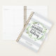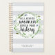 Our chic motivational planner features the quote "well behaved women rarely make history" in hand lettered brush script encircled by a watercolor botanical wreath in blue and green on a neutral grey striped background. Personalise with the year and your name, or your choice of personalisation.