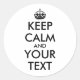 Make customised keep calm round stickers with this template.  It has the keep calm crown logo in black and words in black letters.  It says Keep Calm and Your Text.