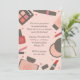 Make up Birthday party invitation featuring nail polish, lipstick, eye shadow, blush, perfume, eye pencils, mascara and hand lotion. The background is set in light pink. © Mood 4 Cute