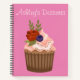 An image of a cupcake with pink icing and fruit on top. Interior is designed for writing down your favourite recipes. You can change the colour of the cover and edit the text.