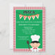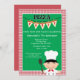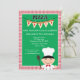 Make your own pizza birthday party. Celebrate and make pizza invitation has a red and white chequered border with a green square centre where you personalise with your party information. There's a cute boy dressed as a chef.