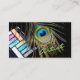 Makeup artist business card design with peacock feather and colourful eye shadow palette on black background. This stylish profile card is perfect for trendy girls, beauticians, cosmetologists, hair and makeup beauty salons and other similar professions. If you need any help with this design, feel free to contact me.