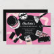 Colourful makeup makeover birthday party invitation set on a bright pink background with a coordinating black background for an extra special touch.
