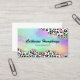 Funky colourful business cards featuring a multi-coloured leopard print background, a rainbow ombre centre with gold glitter edges, your name, title, contact details, and social media icons. The icons can be removed by clicking on personalise and then tap to customise further.