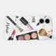 Destei's illustration of different kind of makeup products. There is a pink lipstick, a red lipstick, a black mascara, a makeup palette, some makeup brushes and pencils. There is also a personalizable text area for a name in lovely calligraphy font. The background is a light faux marble texture look-like. Notice: This item is not made of real marble.