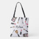This bag features Destei's makeup products illustration including lipstick, makeup brushes, palettes, lip gloss and mascara. The makeup items are placed around the edges of the bag leaving space in the middle for a personalised name.