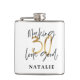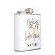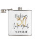 The flask itself is fine. It’s a cheap flask, obviously bought in bulk, however am prepared to overlook that. Given that it is a personalized item, I would have liked to have seen gift boxing instead of the generic packaging. Terrible printing, and/or quality. It’s a cheap, tacky vinyl. It is not cut straight and is also applied in a way that it is overhanging the bottom, causing the glue to catch on items and it will eventually roll and tear, damaging the wrap.