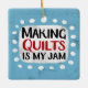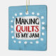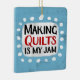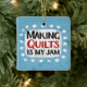 "Making Quilts Is My Jam" is a cute text design in blue with black and red text, along with a white accent shape and white textured whimsical dots surrounding it.