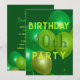 Green birthday party invitation for adult male or female. Big balloons in shades of green decorate both sides of these flat cards. Bold text on the front to announce a party, with a place for his age. Perfect for a milestone event in March, or to celebrate an Irishman.