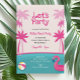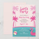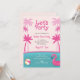 Throw a birthday party by the pool with this modern "Malibu beach doll" inspired pool party invitation for kids or teenagers. At the top is "let's party" displayed in a bright pink retro font. The design also features pink palm trees and a swimming pool with a flamingo floaty and a beach ball. The back of the card is pink but you can change this to any colour.