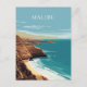 Stunning graphic illustration of the Malibu coast, featuring dramatic brown cliffs, a small sandy beach, and vibrant turquoise ocean water under a clear blue sky.