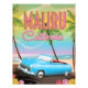 Malibu California vintage travel poster of a classic old car by a beautiful beach.