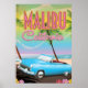 Malibu California vintage travel poster of a classic old car by a beautiful beach.