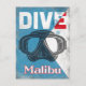 Malibu California vintage scuba mask travel poster design. A blue and white diver down flag background with a retro scuba mask and word "Dive" at the top.