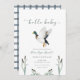 The PENELOPE mallard duck baby shower invite design features a white background with watercolor mallard duck and some cattail plants along the bottom, paired with the phrase 'hello baby' using a handwritten script font in teal blue, with the other hunting themed baby shower details in grey to add visual interest to your duck baby shower invitation. Personalise this hunting mallard baby shower invitation by adding names, date, time, venue and other details. There is an optional back side with a navy blue grandmillenial check pattern.