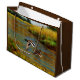 Male and female mallard ducks in flight over a golden pond, water rippling to reflect the colours of the background autumn foliage glowing in the sunlight. Realistic artwork created from an original oil painting by wildlife artist Crista S. Forest.