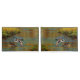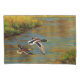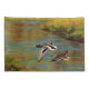 Male and female mallard ducks in flight over a golden pond, water rippling to reflect the colours of the background autumn foliage glowing in the sunlight. Realistic artwork created from an original oil painting by wildlife artist Crista S. Forest.