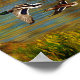 Male and female mallard ducks in flight over a golden pond, water rippling to reflect the colours of the background autumn foliage glowing in the sunlight. Realistic artwork created from an original oil painting by wildlife artist Crista S. Forest.
