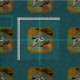 Male and female mallard ducks in flight over a golden pond, water rippling to reflect the colours of the background autumn foliage glowing in the sunlight. Accented with a matching teal green background.