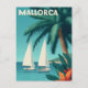 This vintage-style poster captures the serene beauty of Mallorca's coastline, where gentle waves meet golden beaches lined with swaying palm trees. Elegant sailing boats glide across the turquoise sea beneath a warm, sunlit sky. Rendered in soft retro colours and textures, the artwork evokes the charm of mid-century Mediterranean holidays — perfect for travel lovers and fans of vintage coastal design.