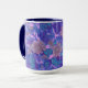 Coffee mug featuring "Mallow Bloom" painting, blooming summer flowers in twilight colour palette - purple, violet, mauve, teal. Acrylic on paper, digital manipulations, 2020