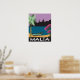 Original Malta colorful illustration celebrating the island of Malta in the Mediterranean Sea, modeled after the vintage travel style posters of the past. The brightly colored poster includes a view of the Valletta skyline and the Basilica, a stylized palm tree, bougainvillea flowers, and a painted boat on the water. The name Malta is at the bottom in a deco font in white.