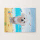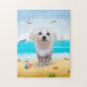 A maltese dog sitting on beach is a perfect gift idea for someone who love this dog breed.