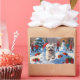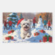 A fluffy Maltese joyfully runs through the snowy landscape, wearing a festive red Christmas hat. This charming winter scene highlights the breed’s silky coat, playful personality, and cheerful spirit while capturing the warmth and magic of the holiday season. A delightful design filled with festive charm.
